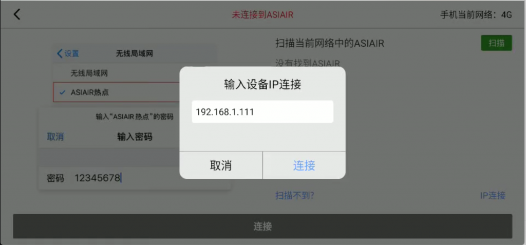 桥接设置好后,把手机的WIFI切换成同一个WIFI,或者同一个网段,或者只要能PING通的任何局域网都可以,都可以。如果不是在同一个网段,ASIair可能搜不到啊搜不到。此时选择屏幕右下方的IP连接,输入ASIAIR的IP就可以了。