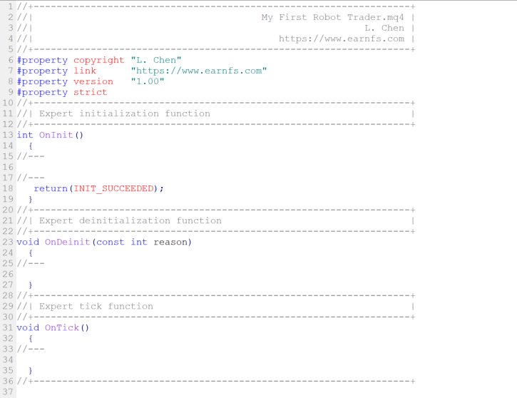 After all those procedures, you can get a sample code like this. We will build our robot trader from those simple scaffolds.