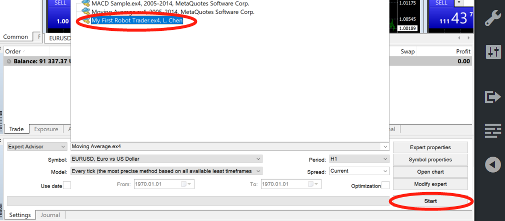 Now you can see your trader now. You can leave the options in default and click Start. However your code will do nothing cause of no action in your code hence an horizontal line will be generated meaning no fluctuation on your virtual fund.