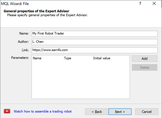 Fill your trader name, your name and website. Also, the parameters is optional. Those set parameters can be modified via the trader window thus no need for changing the code.